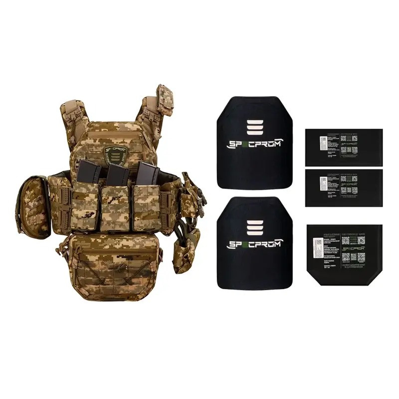 Керамічні плити розміром 250×300 мм виготовлені з поєднання оксиду алюмінію (Al₂O₃) і надвисокомолекулярного поліетилену (НВМПЕ). Завдяки такій комбінації досягається висока кулестійкість при вазі всього 2,8 кг за плиту. Вони забезпечують захист від куль, уламків та вибухових хвиль, а всі протоколи випробувань додаються до комплекту.